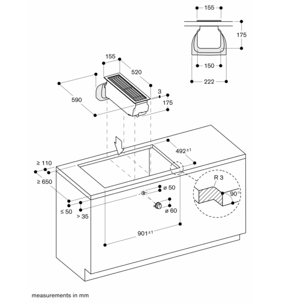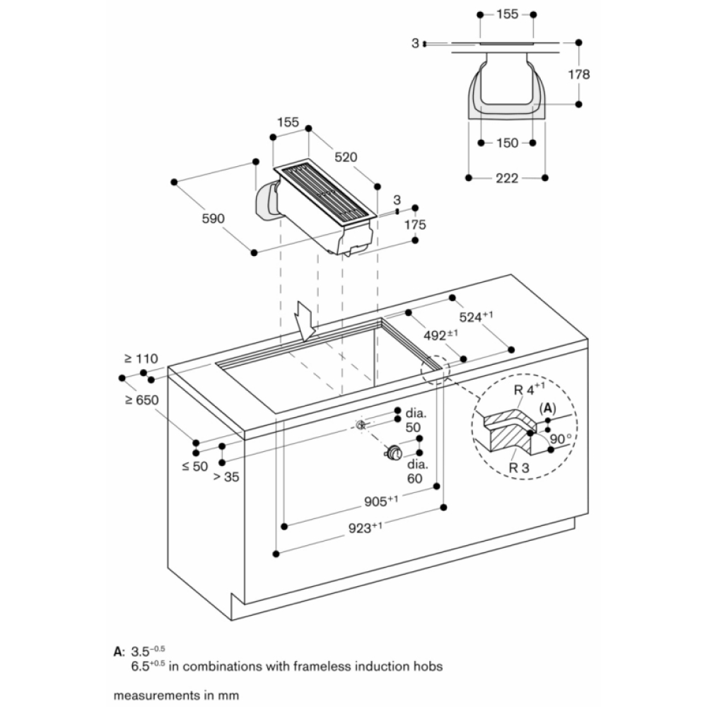 Máy hút mùi Gaggenau VL414115 có kích thước 17,8 cm x 15,5 cm x 52 cm và thuộc kiểu lắp đặt âm bàn. Do đó, người dùng cần tuân thủ các tiêu chuẩn về thông số kỹ thuật khi lắp đặt do hãng cung cấp, để đảm bảo tính thẩm mỹ và khả năng hoạt động ổn định của máy.