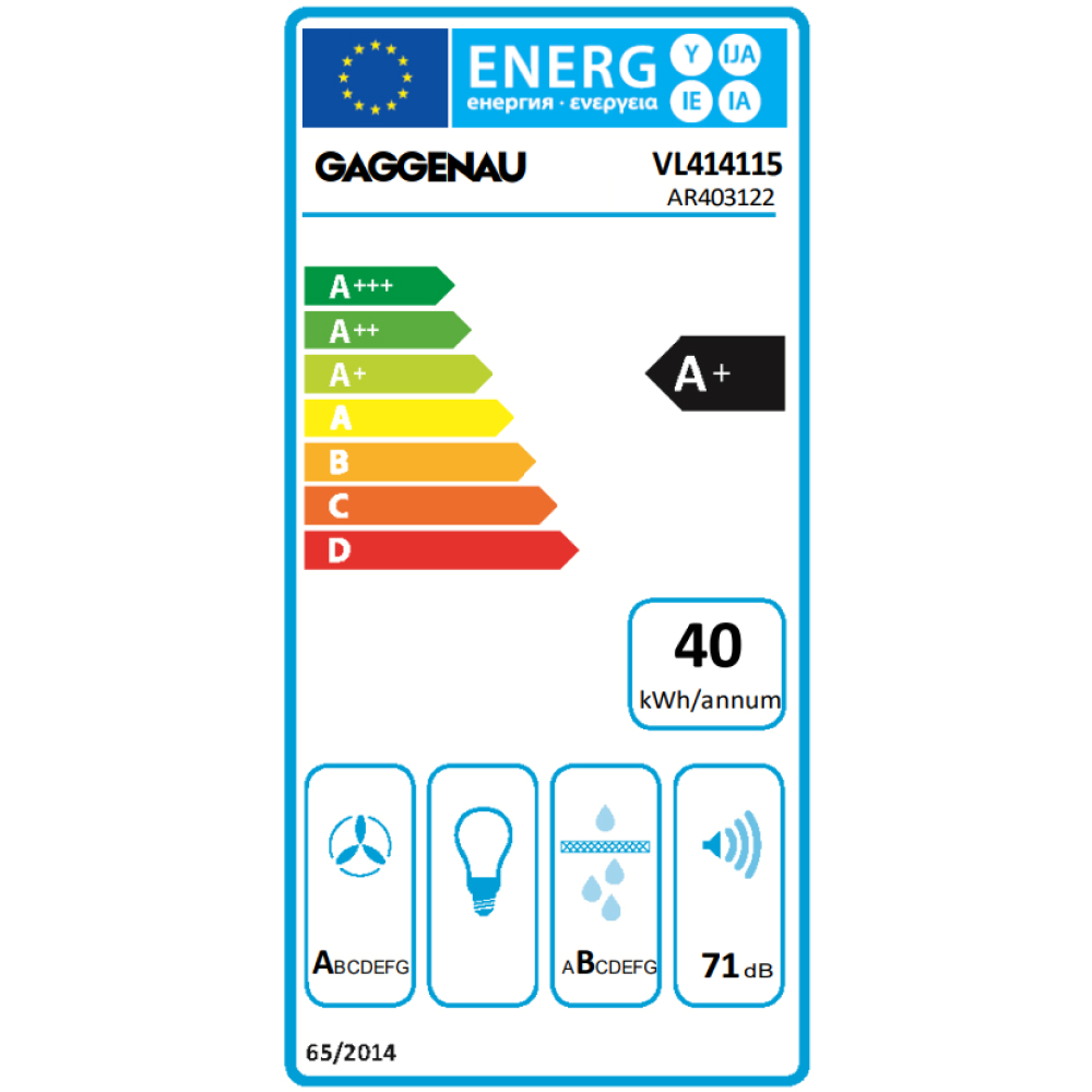 Nhãn năng lượng của máy hút mùi Gaggenau VL414115 đạt mức A+, an tâm về khả năng tiết kiệm điện cho người dùng.