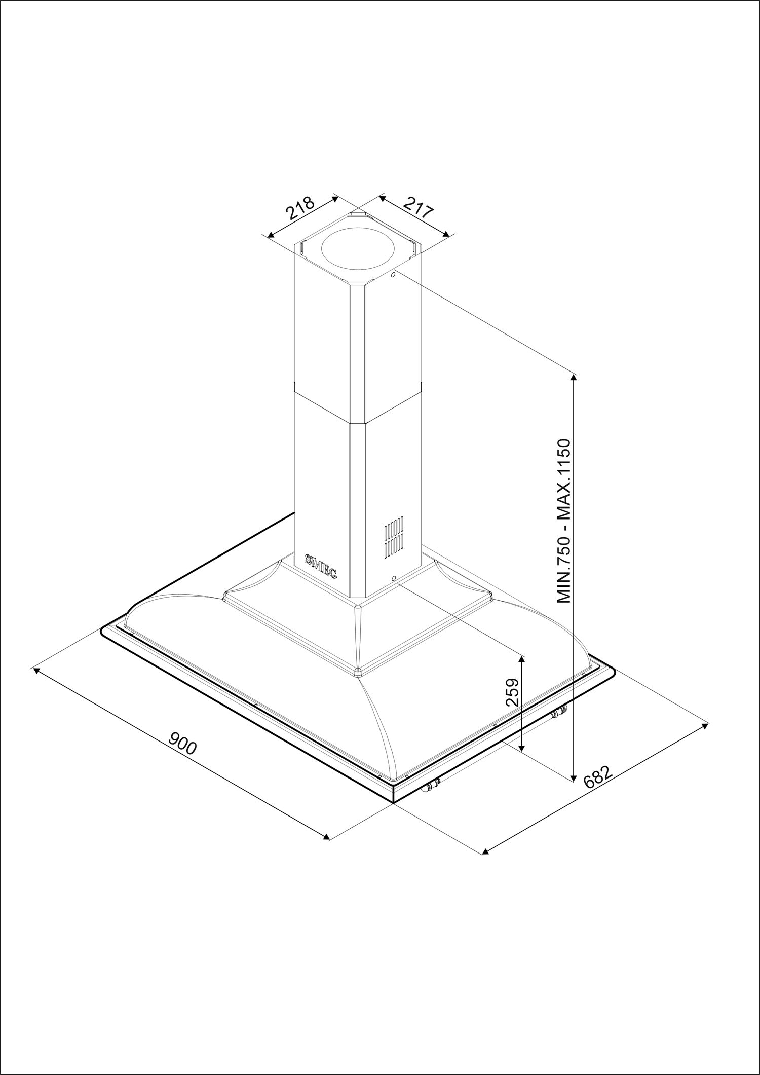 Mời quý khách tham khảo kích thước lắp đặt của máy hút mùi đảo Smeg Cortina KCI19 dưới đây.