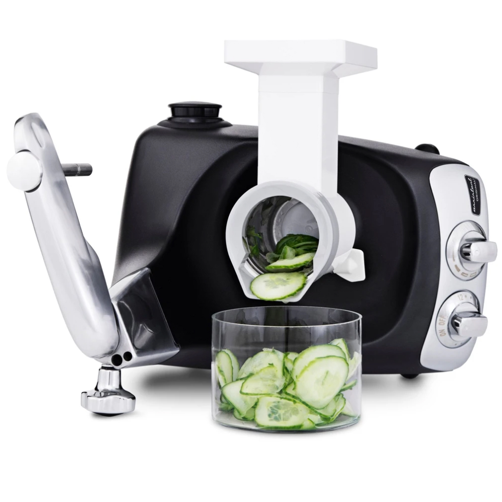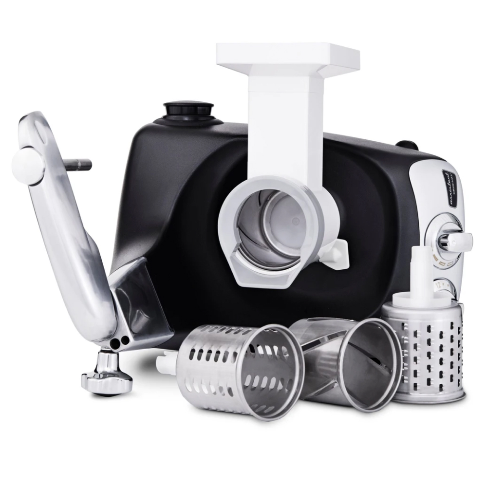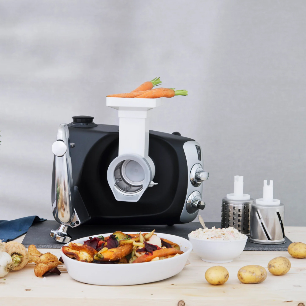 | Bao gồm | – Máy xay sinh tố: Cối xay, Nắp máy xay, Nắp đong, Dụng cụ nén – Máy vắt cam: Ca đựng, dụng cụ vắt và rây lọc – Máy cắt rau củ: Lưỡi thái lát, Lưỡi bào thô, Lưỡi bào trung bình, Thanh đẩy cho máy cắt rau củ, Vòng khóa và Vỏ máy |